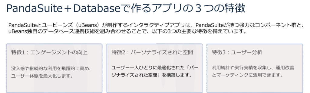 PandaSuiteとDB連携が創るパーソナライズアプリの未来 2026 3/12 Information 2026年3月12日 Information よかったらシェアしてね! URLをコピーしました! URLをコピーしました! PandasuiteとuBeansの技術戦略 関連記事 PandasuiteとuBeansの技術戦略 2026年1月23日 Pandasuiteの「プロ向け」機能3選 2025年12月23日 アプリにChatGPT機能を統合 2025年11月13日 Pandasuite Showcase 2025年11月6日 Pandasuite Blog Customer Story 2025年11月5日 Panda Suite NewsLetter 2025年8月26日 WEBサイトリニューアル 2025年7月28日