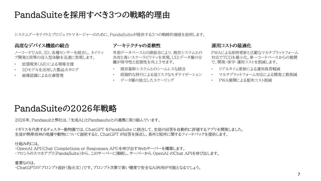 PandasuiteとuBeansの技術戦略 2026 1/23 Information 2026年1月23日 Information よかったらシェアしてね! URLをコピーしました! URLをコピーしました! Pandasuiteの「プロ向け」機能3選 関連記事 Pandasuiteの「プロ向け」機能3選 2025年12月23日 アプリにChatGPT機能を統合 2025年11月13日 Pandasuite Showcase 2025年11月6日 Pandasuite Blog Customer Story 2025年11月5日 Panda Suite NewsLetter 2025年8月26日 WEBサイトリニューアル 2025年7月28日